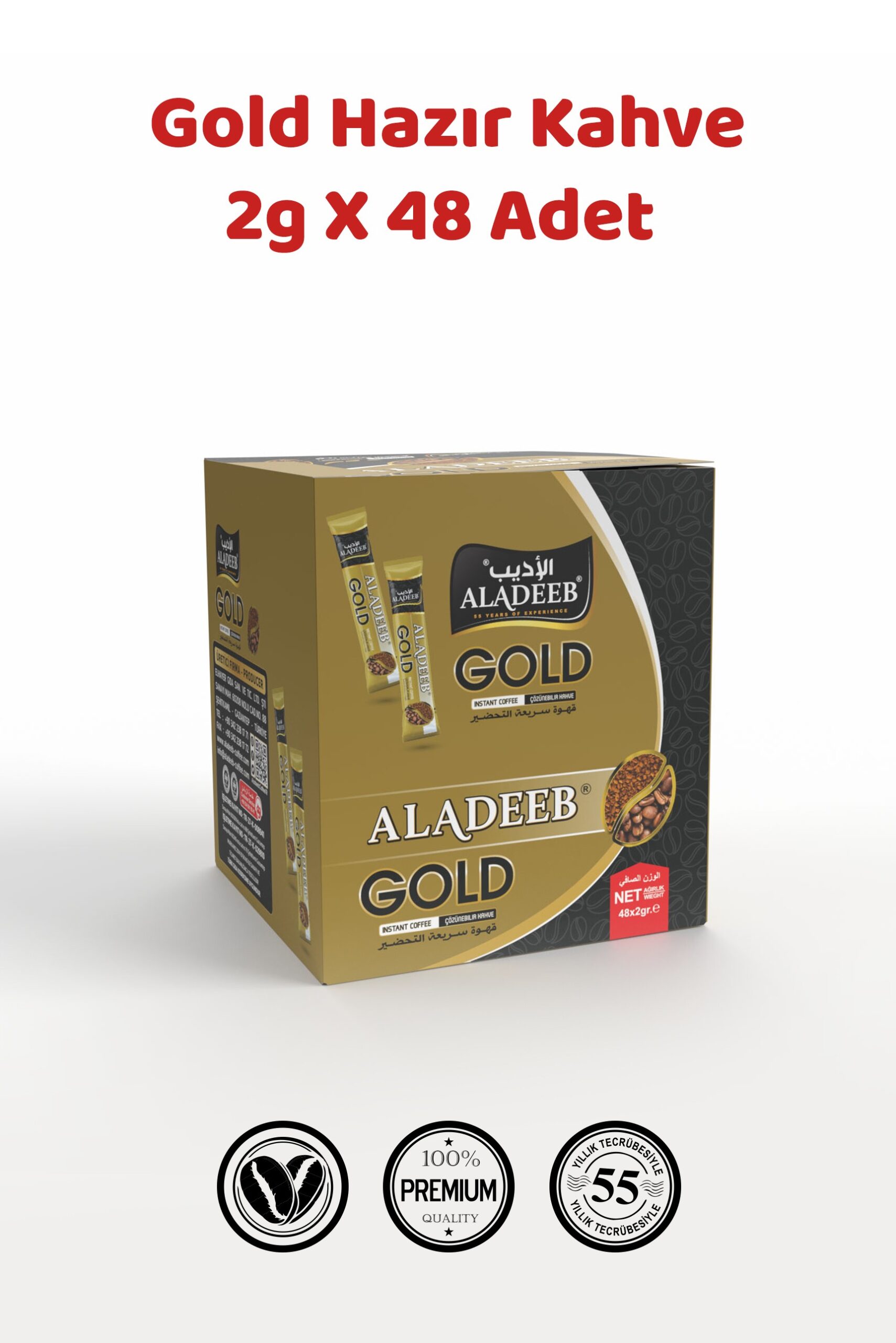 ALADEEB Gold Hazır Kahve 2 g x 48 Adet – Şekersiz Granül Çözünebilir KahveGold Hazır Kahve 2 g x 48 Adet Şekersiz Çözünebilir Kahve🟦 KISA ÜRÜN ÖZETİ :%100 çözünebilir granül kahveden üretilen ALADEEB Gold Hazır Kahve, şekersiz ve katkısız içeriği ile sade kahve severler için pratik bir içim sunar. 48 adet 2 g tek kullanımlık paket içerir. Sıcak su ile hızlı hazırlanır ve taşınabilir yapısıyla günlük kullanım için uygundur ☕✨🟦 UZUN ÜRÜN AÇIKLAMASI :ALADEEB Gold Hazır Kahve 2 g x 48 Adet, %100 çözünebilir granül kahve içeren sade ve şekersiz bir hazır kahve seçeneğidir. İlave şeker, glikoz şurubu veya katkı maddesi içermez.Her kutuda 48 adet tek kullanımlık 2 gramlık poşet bulunur. Granül formu sayesinde suda kolay çözünür ve pratik hazırlama imkânı sunar. Evde, ofiste, seyahatte ve günlük kahve tüketimi için uygundur ☕Hazırlanışı:1 poşetin tamamı bir fincana boşaltılır. Üzerine yaklaşık 150 ml sıcak su eklenerek karıştırılır. Kahve yoğunluğu damak zevkine göre ayarlanabilir.Şekersiz yapısı sayesinde sade kahve tercih edenler için ideal bir içim sunar. Dileyen kullanıcılar tatlandırıcı veya şeker ekleyerek kişisel tercihe göre tüketebilir.Tek kullanımlık ambalaj yapısı sayesinde hijyenik, ölçülü ve taşınabilir bir kullanım sağlar. Çantada taşımaya uygundur ve tazeliğini korumaya yardımcı olur.Ürünlerimizin hiçbir çeşidinde domuz yağı veya domuz kaynaklı katkı bulunmaz.Türk Gıda Kodeksi’ne uygun şekilde üretilmiştir.🟦 İÇİNDEKİLER:%100 Çözünebilir Kahve (Granül Form)🟦 ŞEKER & KATKI BİLGİSİŞeker içermezGlikoz şurubu içermezİlave tatlandırıcı içermez🟦 BESİN DEĞERLERİ (1 PORSİYON = 2 g)Enerji: 5 kcalToplam Yağ: 0,01 gDoymuş Yağ: 0,04 gKarbonhidrat: 0,82 gŞeker: 0 gProtein: 0,24 gSodyum: 1 mgPotasyum: 71 mg(Değerler ambalaj üzerindeki resmi besin tablosuna göre yazılmıştır.)🟦 ÜRÜN ÖZELLİKLERİGramaj: 2 g x 48 adetToplam Net Miktar: 96 gForm: Granül hazır kahveŞeker: İçermezHazırlama: 150 ml sıcak su ileKargo: TrendexpressSaklama: Serin ve kuru yerde muhafaza edinizMenşei: Türkiye